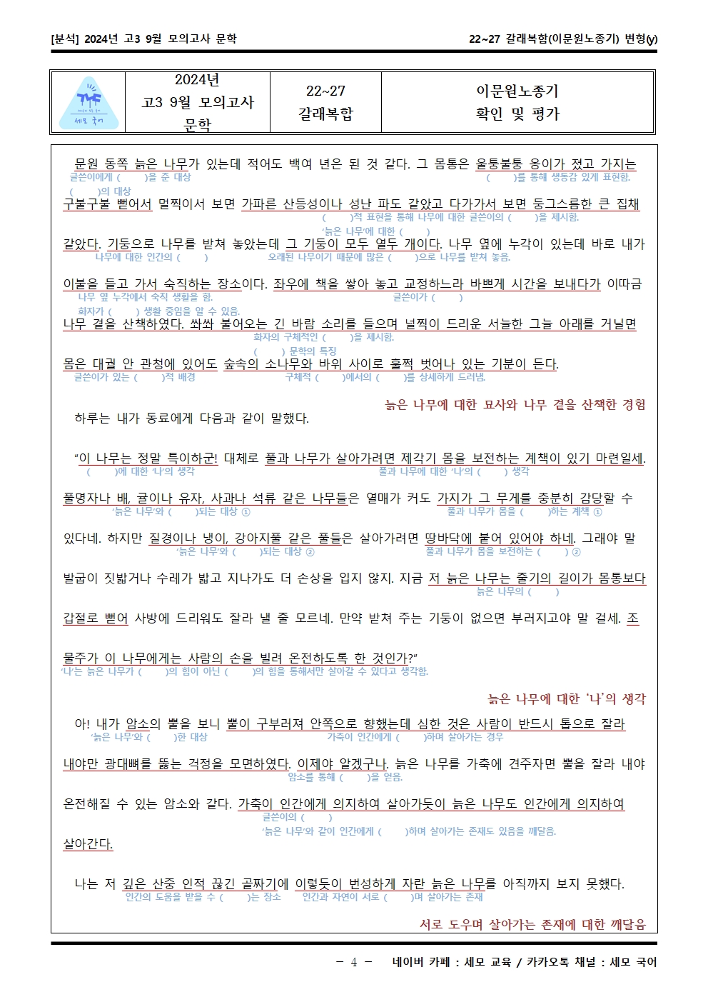 2024년 고3 9월 모의고사 문학 22~27 갈래복합(이문원노종기) 분석해석해설이 제작됐습니다! 세모 국어의 선생님들이 집중하여 최선을 다해 만든 자료인 만큼 내신, 수능 대비에 큰 도움이 되리라 자부합니다.