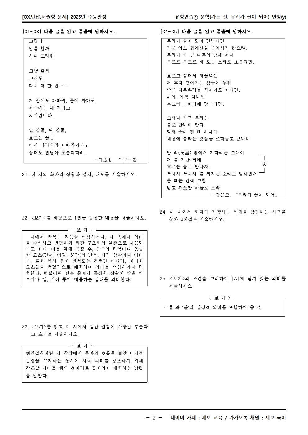 2025년 수능완성 유형연습① 문학(가는 길, 우리가 물이 되어) OX,단답,서술형 변형문제가 제작됐습니다! 세모 국어의 선생님들이 집중하여 최선을 다해 만든 자료인 만큼 내신, 수능 대비에 큰 도움이 되리라 자부합니다.