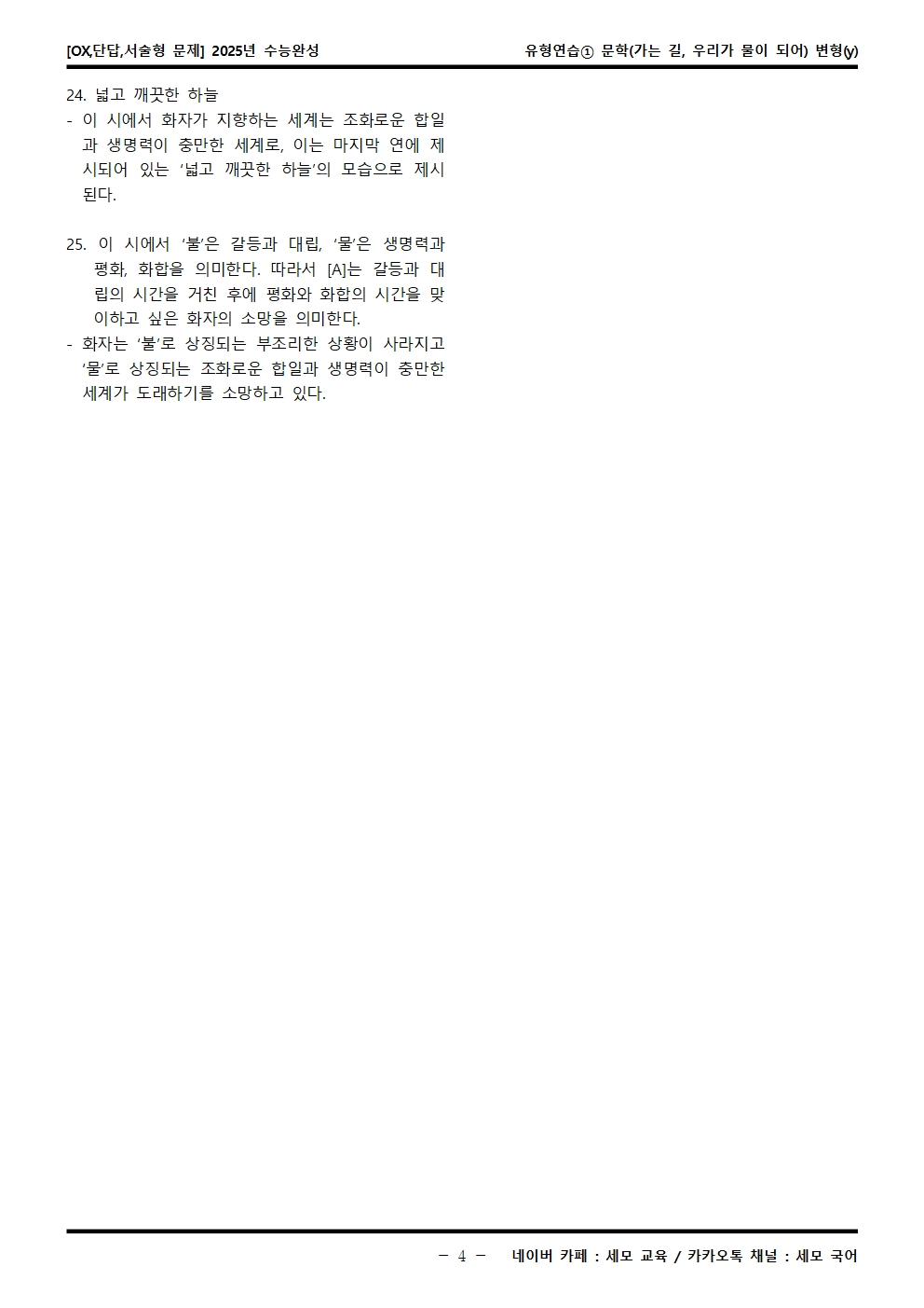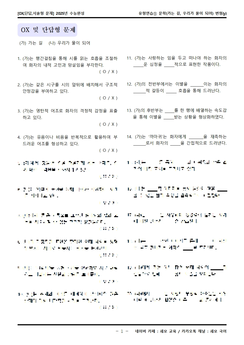 2025년 수능완성 유형연습① 문학(가는 길, 우리가 물이 되어) OX,단답,서술형 변형문제는 수능특강이 내신으로 들어가는 학생분들, 그 학생들을 가르치는 강사·교사·과외 선생님들, 수능을 준비하는 수험생들, 기타 자료가 필요하신 분 등을 위한 자료입니다.