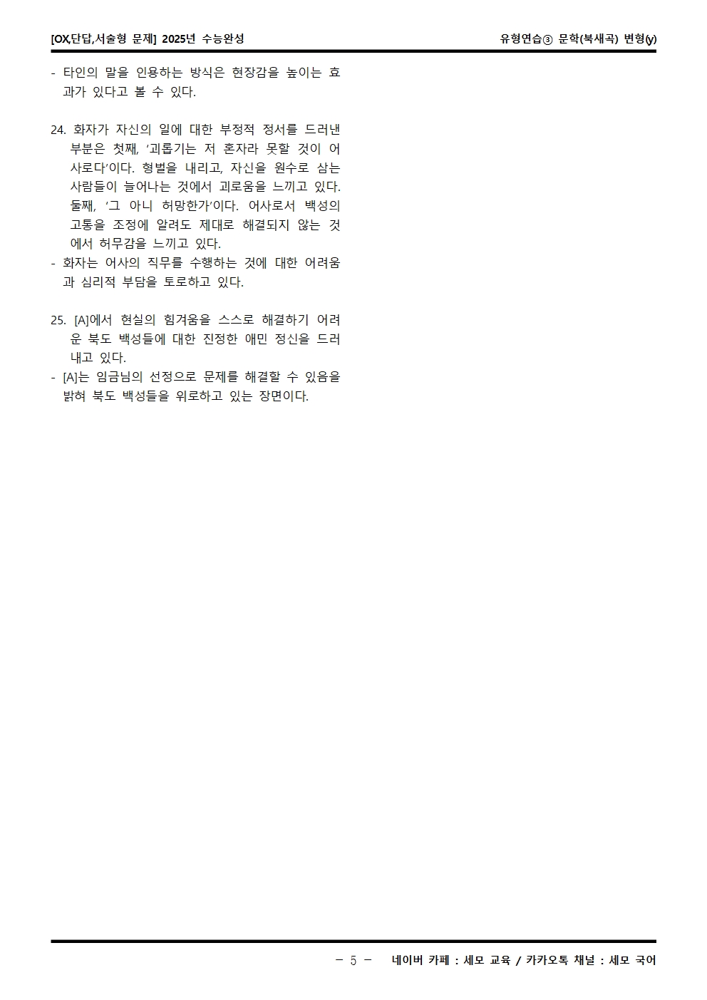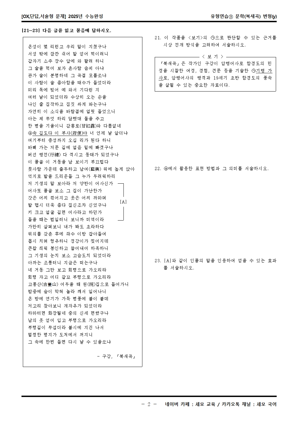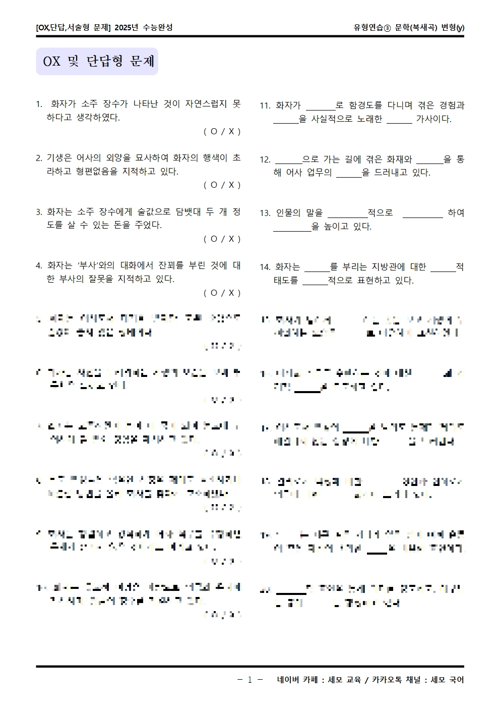 2025년 수능완성 유형연습③ 문학(북새곡) OX,단답,서술형 변형문제는 수능특강이 내신으로 들어가는 학생분들, 그 학생들을 가르치는 강사·교사·과외 선생님들, 수능을 준비하는 수험생들, 기타 자료가 필요하신 분 등을 위한 자료입니다.