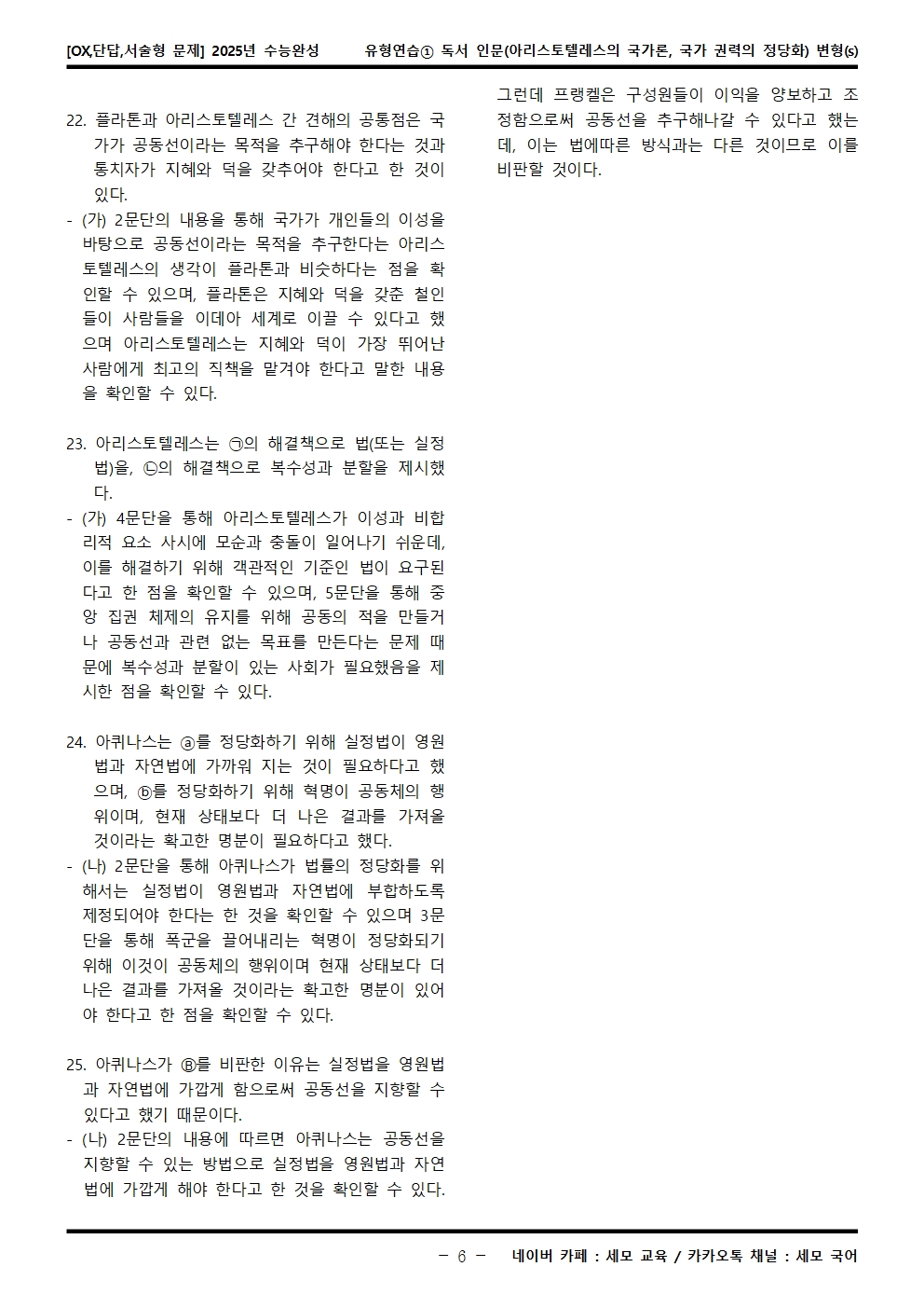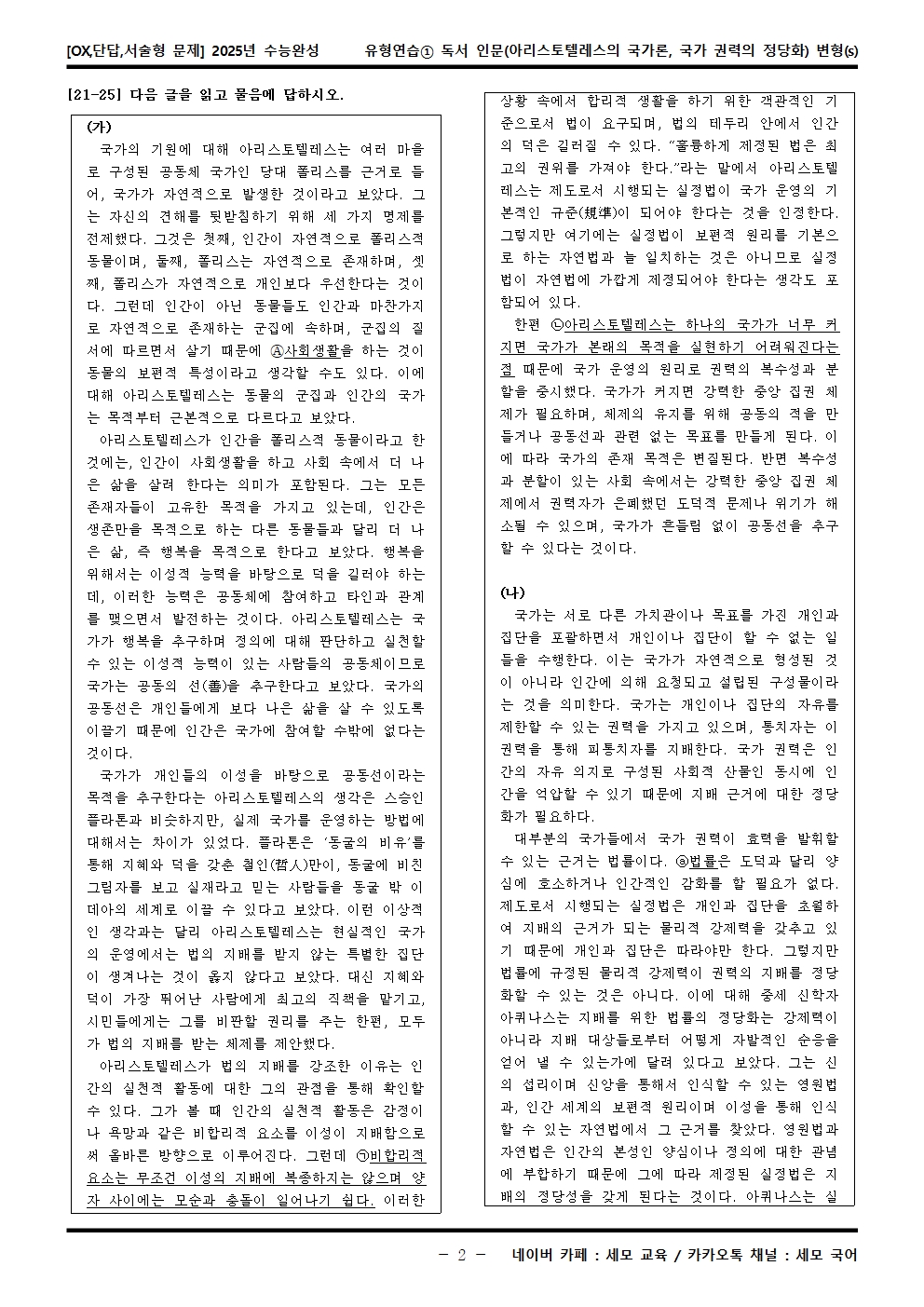 2025년 수능완성 유형연습① 독서 인문(아리스토텔레스의 국가론, 국가 권력의 정당화) OX,단답,서술형 변형문제는 수능특강이 내신으로 들어가는 학생분들, 그 학생들을 가르치는 강사·교사·과외 선생님들, 수능을 준비하는 수험생들, 기타 자료가 필요하신 분 등을 위한 자료입니다.