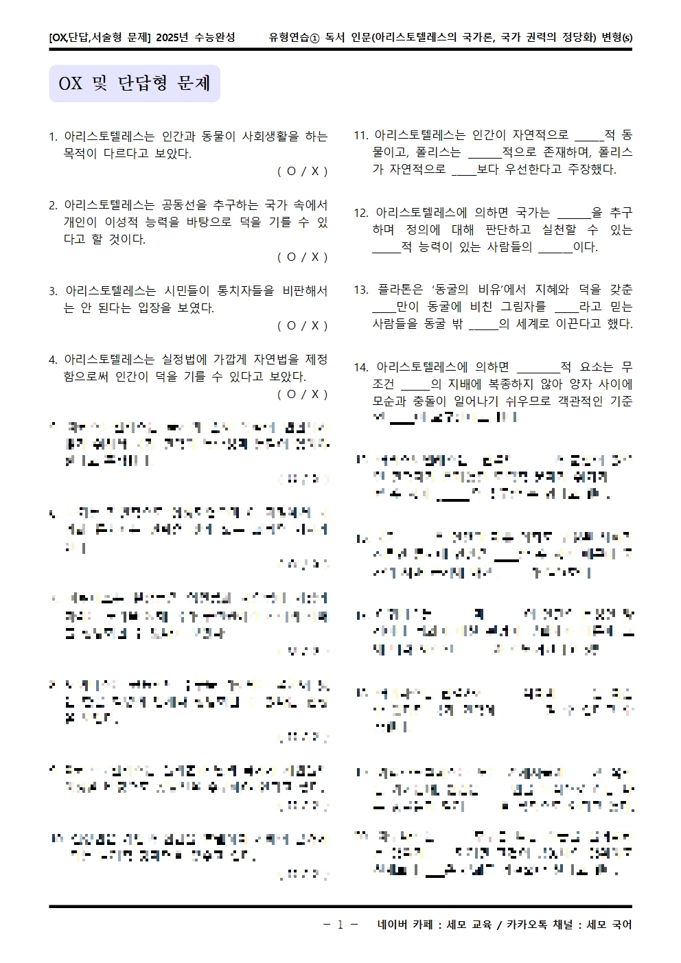 2025년 수능완성 유형연습① 독서 인문(아리스토텔레스의 국가론, 국가 권력의 정당화) OX,단답,서술형 변형문제가 제작됐습니다! 세모 국어의 선생님들이 집중하여 최선을 다해 만든 자료인 만큼 내신, 수능 대비에 큰 도움이 되리라 자부합니다.