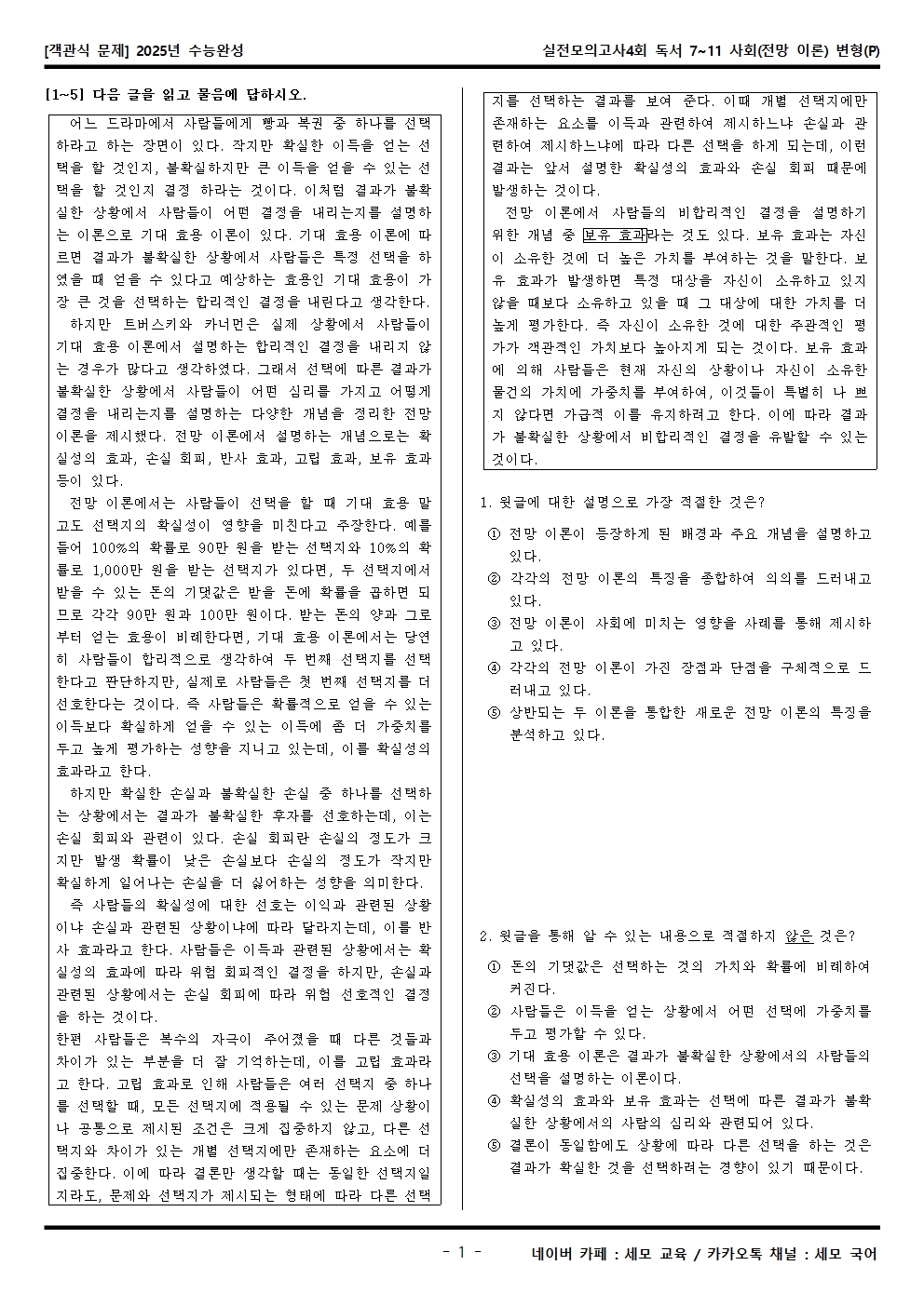 2025년 수능완성 실전모의고사4회 독서 7~11 사회(전망 이론) 객관식 변형문제가 제작됐습니다! 세모 국어의 선생님들이 집중하여 최선을 다해 만든 자료인 만큼 내신, 수능 대비에 큰 도움이 되리라 자부합니다.