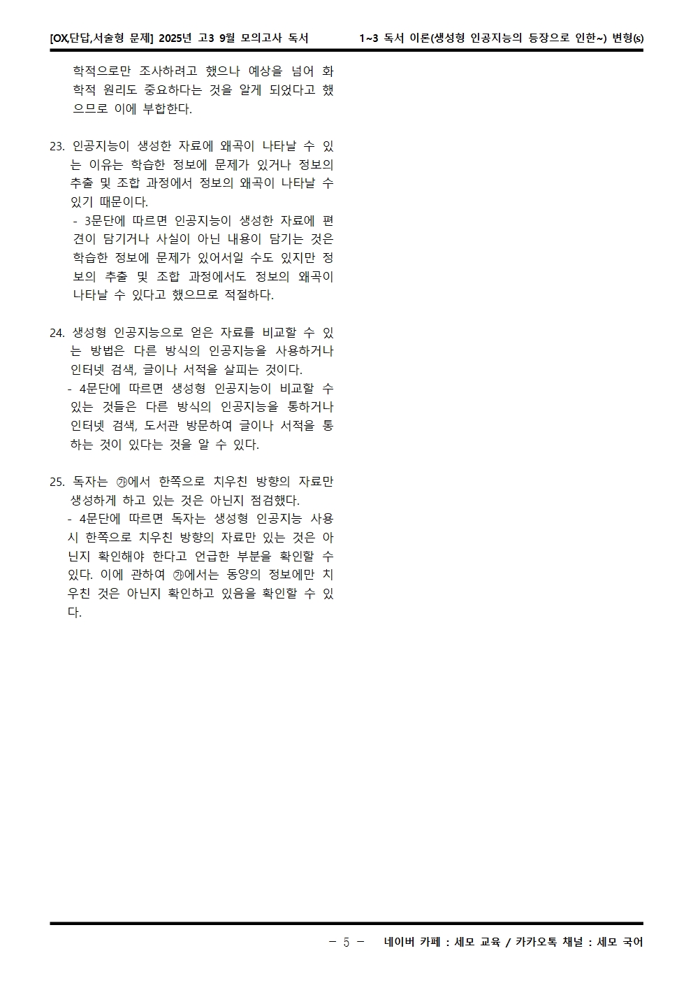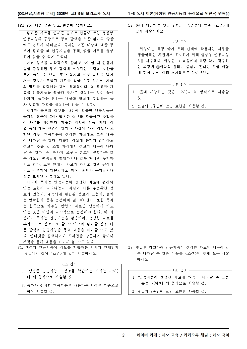 2025년 고3 9월 모의고사 독서 1~3 독서 이론(생성형 인공지능의 등장으로 인한 읽기 양상의 변화) OX,단답,서술형 변형문제는 수능특강이 내신으로 들어가는 학생분들, 그 학생들을 가르치는 강사·교사·과외 선생님들, 수능을 준비하는 수험생들, 기타 자료가 필요하신 분 등을 위한 자료입니다.