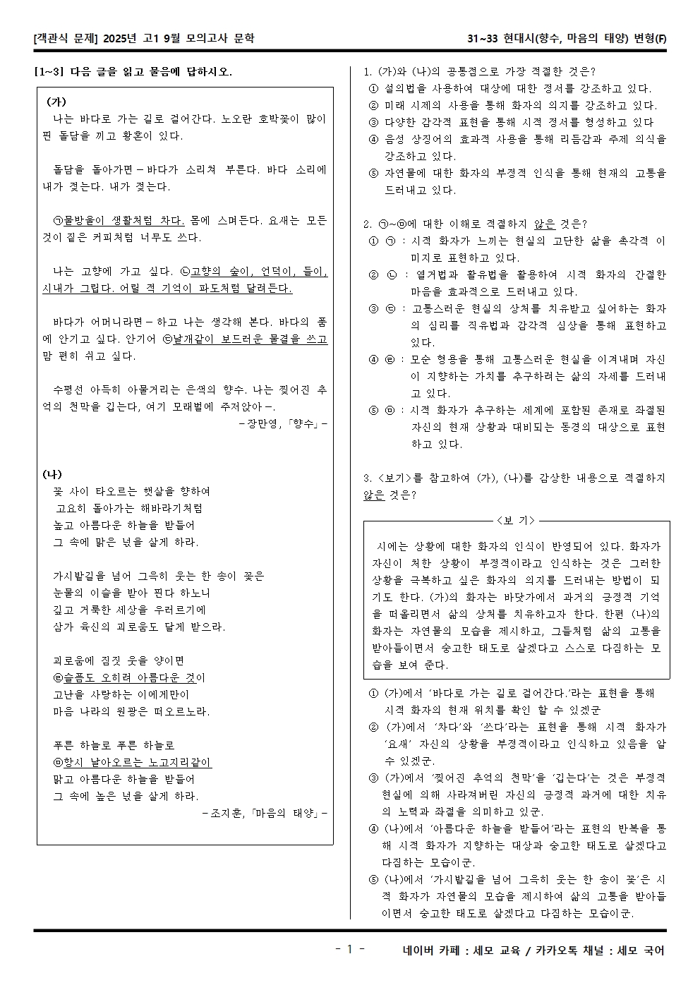 2025년 고1 9월 모의고사 문학 31~33 현대시(향수, 마음의 태양) 객관식 변형문제가 제작됐습니다! 세모 국어의 선생님들이 집중하여 최선을 다해 만든 자료인 만큼 내신, 수능 대비에 큰 도움이 되리라 자부합니다.
