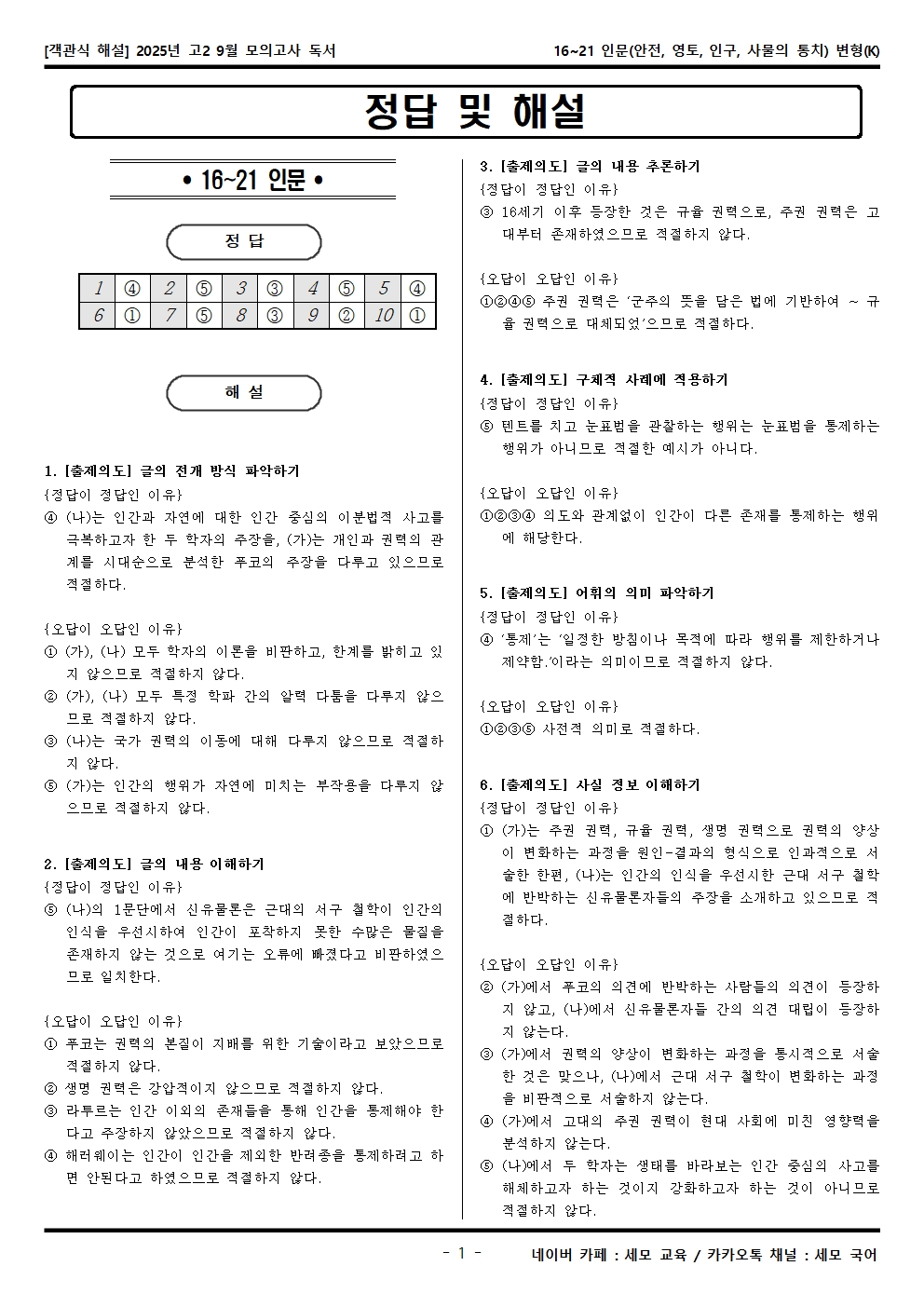 2025년 고2 9월 모의고사 독서 16~21 인문(안전, 영토, 인구, 사물의 통치) 객관식 변형문제가 제작됐습니다! 세모 국어의 선생님들이 집중하여 최선을 다해 만든 자료인 만큼 내신, 수능 대비에 큰 도움이 되리라 자부합니다.
