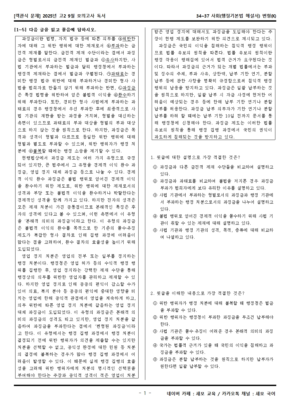 2025년 고2 9월 모의고사 독서 34~37 사회(행정기본법 해설서) 객관식 변형문제는 수능특강이 내신으로 들어가는 학생분들, 그 학생들을 가르치는 강사·교사·과외 선생님들, 수능을 준비하는 수험생들, 기타 자료가 필요하신 분 등을 위한 자료입니다.