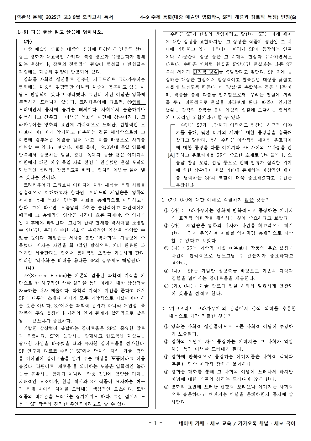 2025년 고3 9월 모의고사 독서 4~9 주제 통합(대중 예술인 영화와~, SF의 개념과 장르적 특징) 객관식 변형문제가 제작됐습니다! 세모 국어의 선생님들이 집중하여 최선을 다해 만든 자료인 만큼 내신, 수능 대비에 큰 도움이 되리라 자부합니다.