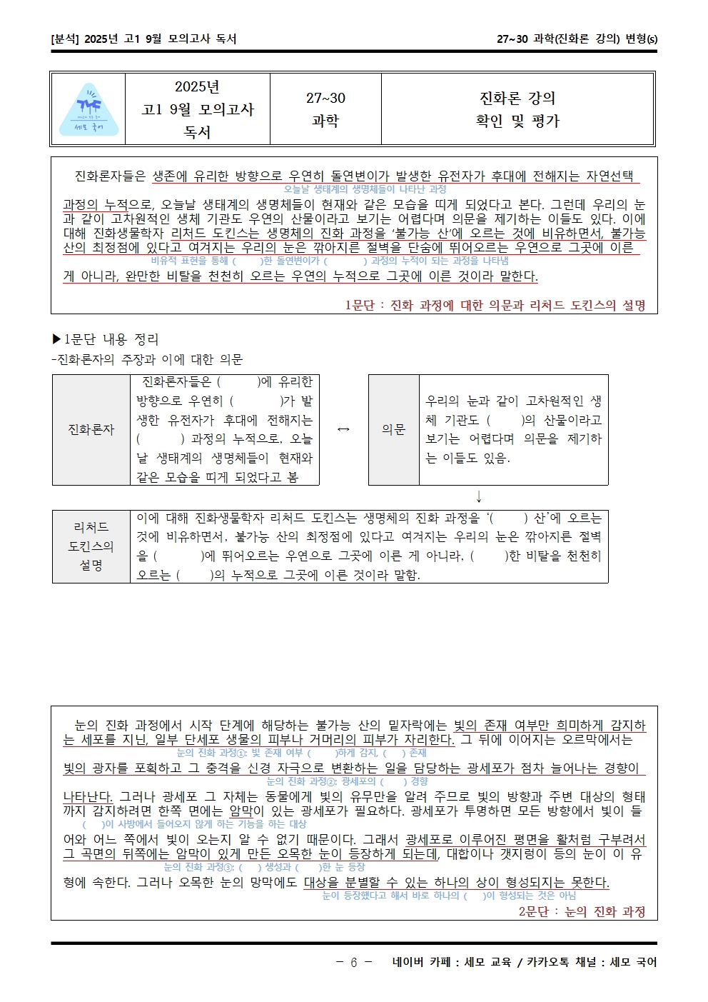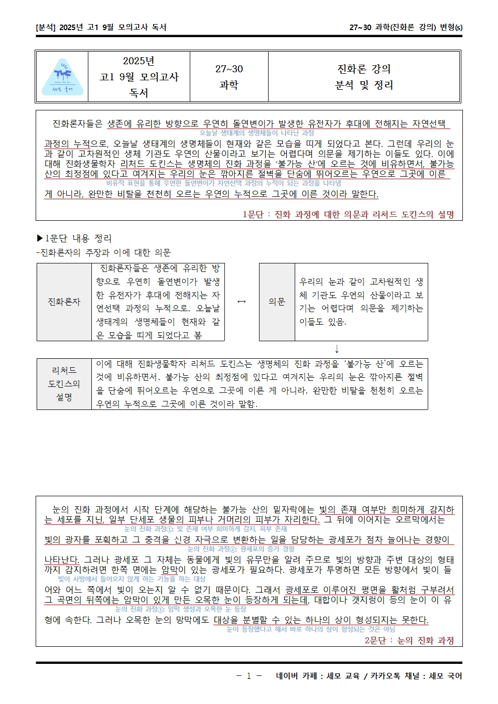 2025년 고1 9월 모의고사 독서 27~30 과학(진화론 강의) 분석해석해설이 제작됐습니다! 세모 국어의 선생님들이 집중하여 최선을 다해 만든 자료인 만큼 내신, 수능 대비에 큰 도움이 되리라 자부합니다.