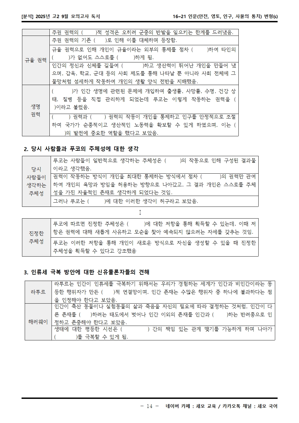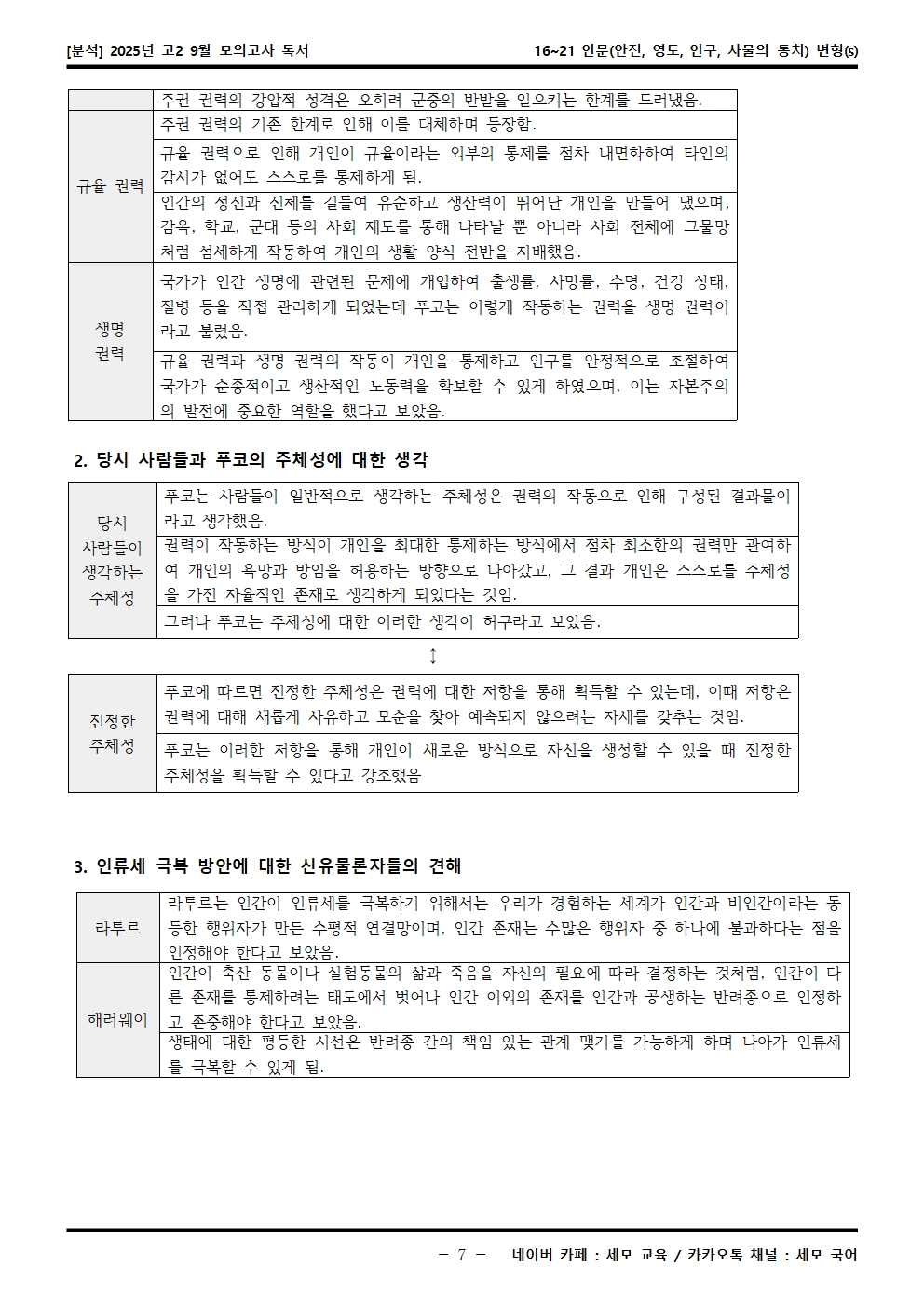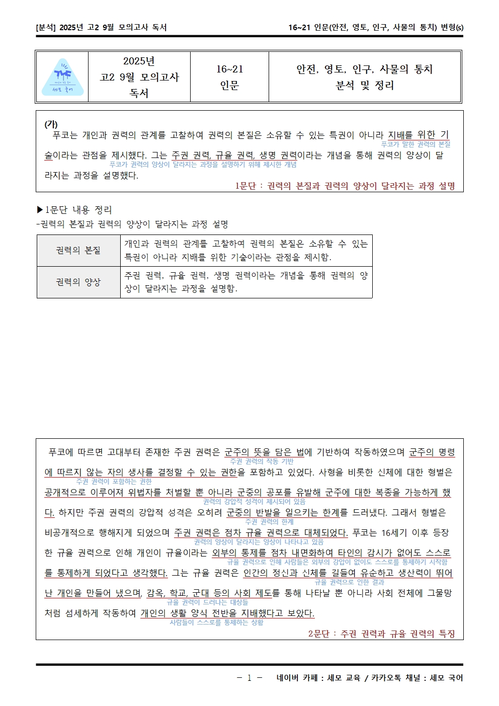 2025년 고2 9월 모의고사 독서 16~21 인문(안전, 영토, 인구, 사물의 통치) 분석해석해설은 수능특강이 내신으로 들어가는 학생분들, 그 학생들을 가르치는 강사·교사·과외 선생님들, 수능을 준비하는 수험생들, 기타 자료가 필요하신 분 등을 위한 자료입니다.