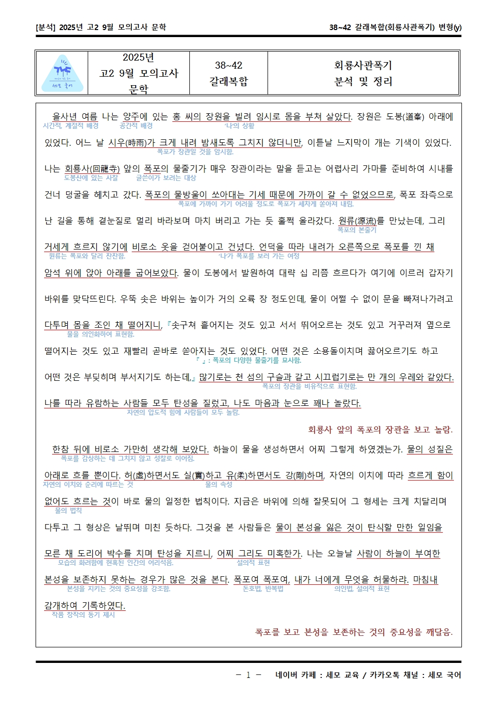 2025년 고2 9월 모의고사 문학 38~42 갈래복합(회룡사관폭기) 분석해석해설이 제작됐습니다! 세모 국어의 선생님들이 집중하여 최선을 다해 만든 자료인 만큼 내신, 수능 대비에 큰 도움이 되리라 자부합니다.