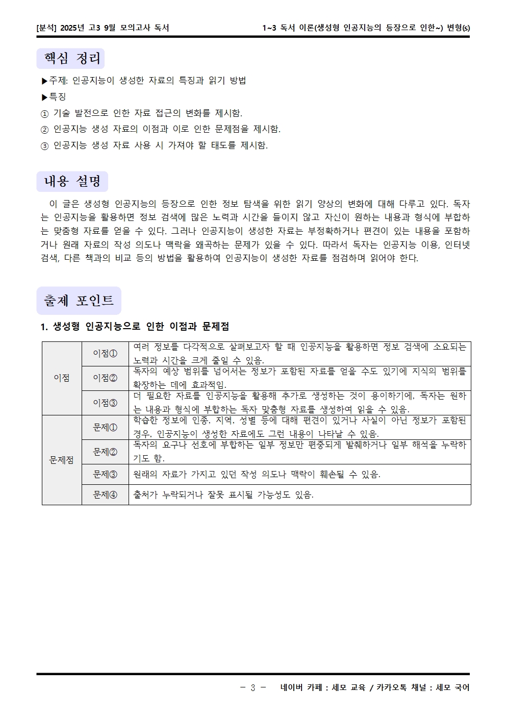 2025년 고3 9월 모의고사 독서 1~3 독서 이론(생성형 인공지능의 등장으로 인한 읽기 양상의 변화) 분석해석해설은 수능특강이 내신으로 들어가는 학생분들, 그 학생들을 가르치는 강사·교사·과외 선생님들, 수능을 준비하는 수험생들, 기타 자료가 필요하신 분 등을 위한 자료입니다.