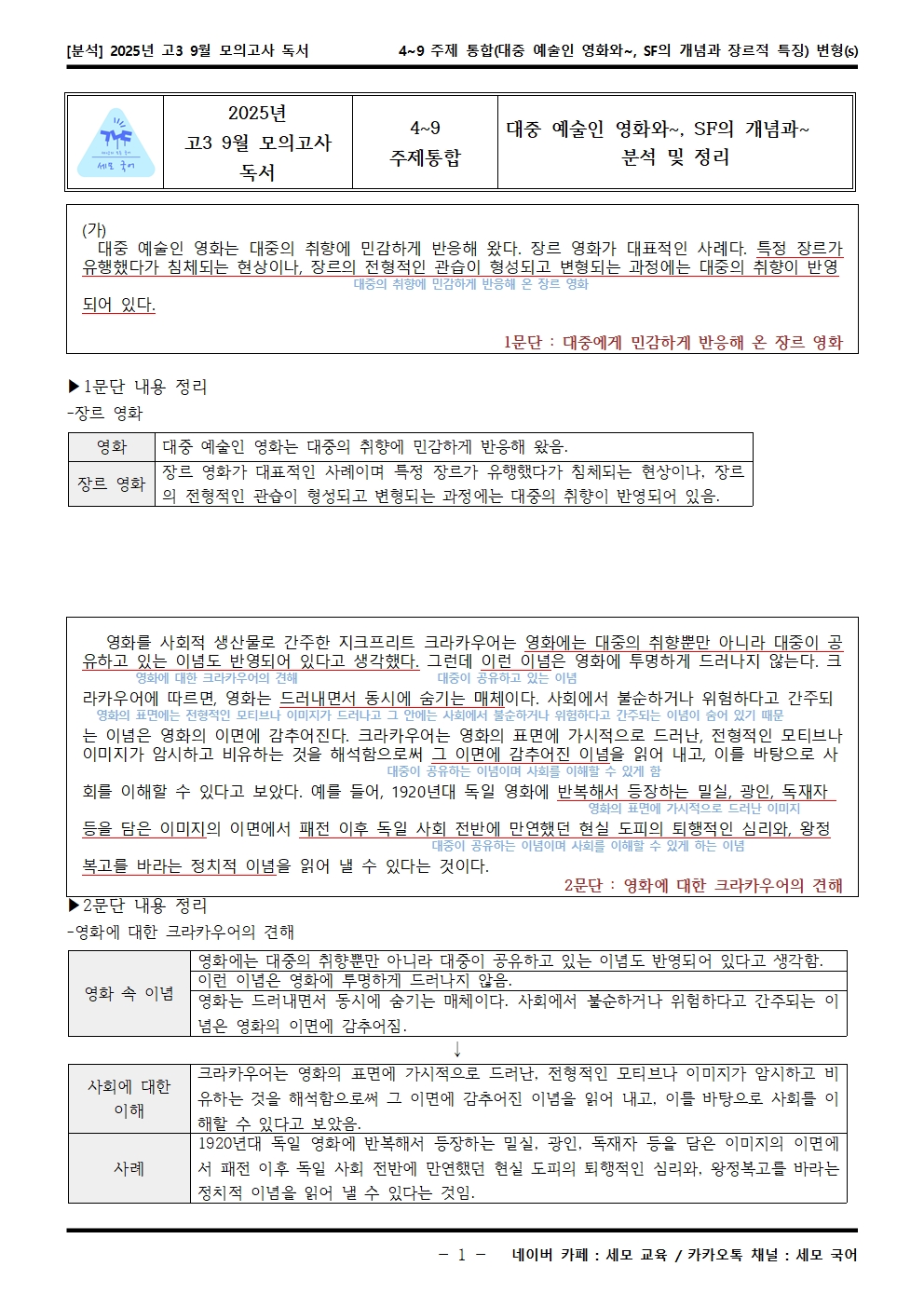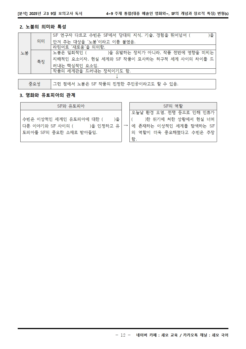 2025년 고3 9월 모의고사 독서 4~9 주제 통합(대중 예술인 영화와~, SF의 개념과 장르적 특징) 분석해석해설이 제작됐습니다! 세모 국어의 선생님들이 집중하여 최선을 다해 만든 자료인 만큼 내신, 수능 대비에 큰 도움이 되리라 자부합니다.