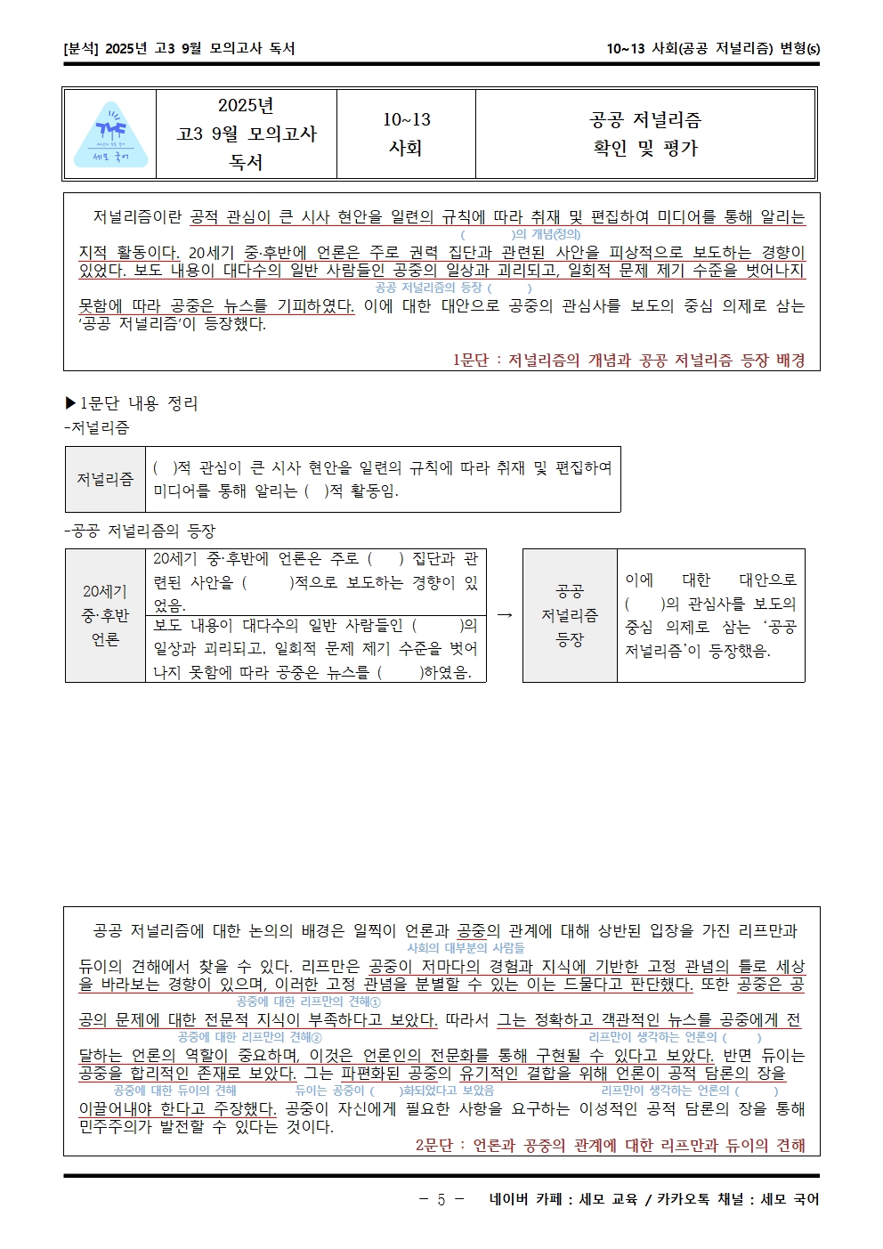 2025년 고3 9월 모의고사 독서 10~13 사회(공공 저널리즘) 분석해석해설이 제작됐습니다! 세모 국어의 선생님들이 집중하여 최선을 다해 만든 자료인 만큼 내신, 수능 대비에 큰 도움이 되리라 자부합니다.