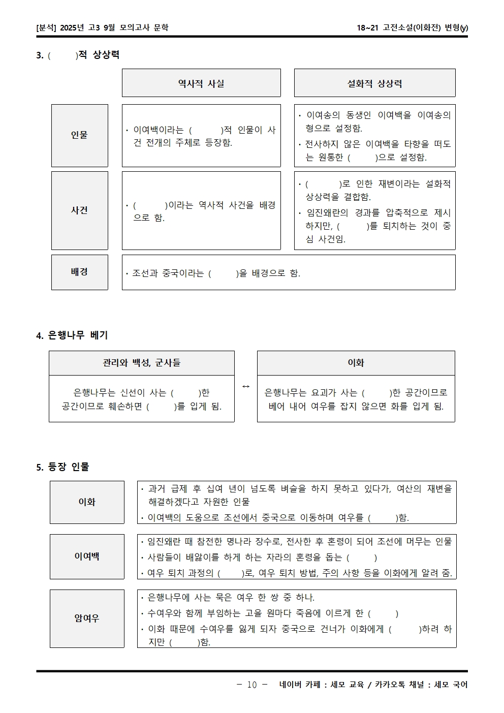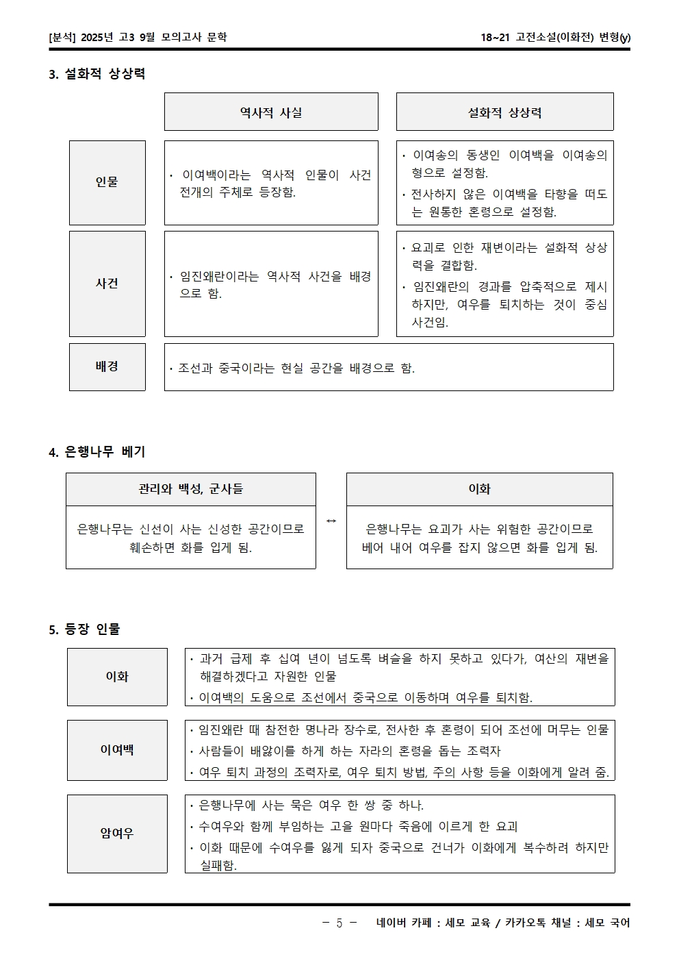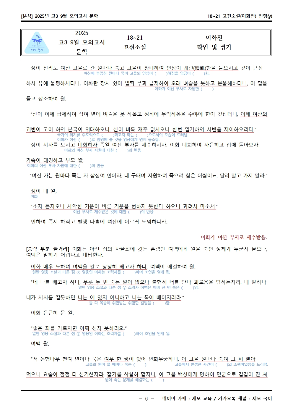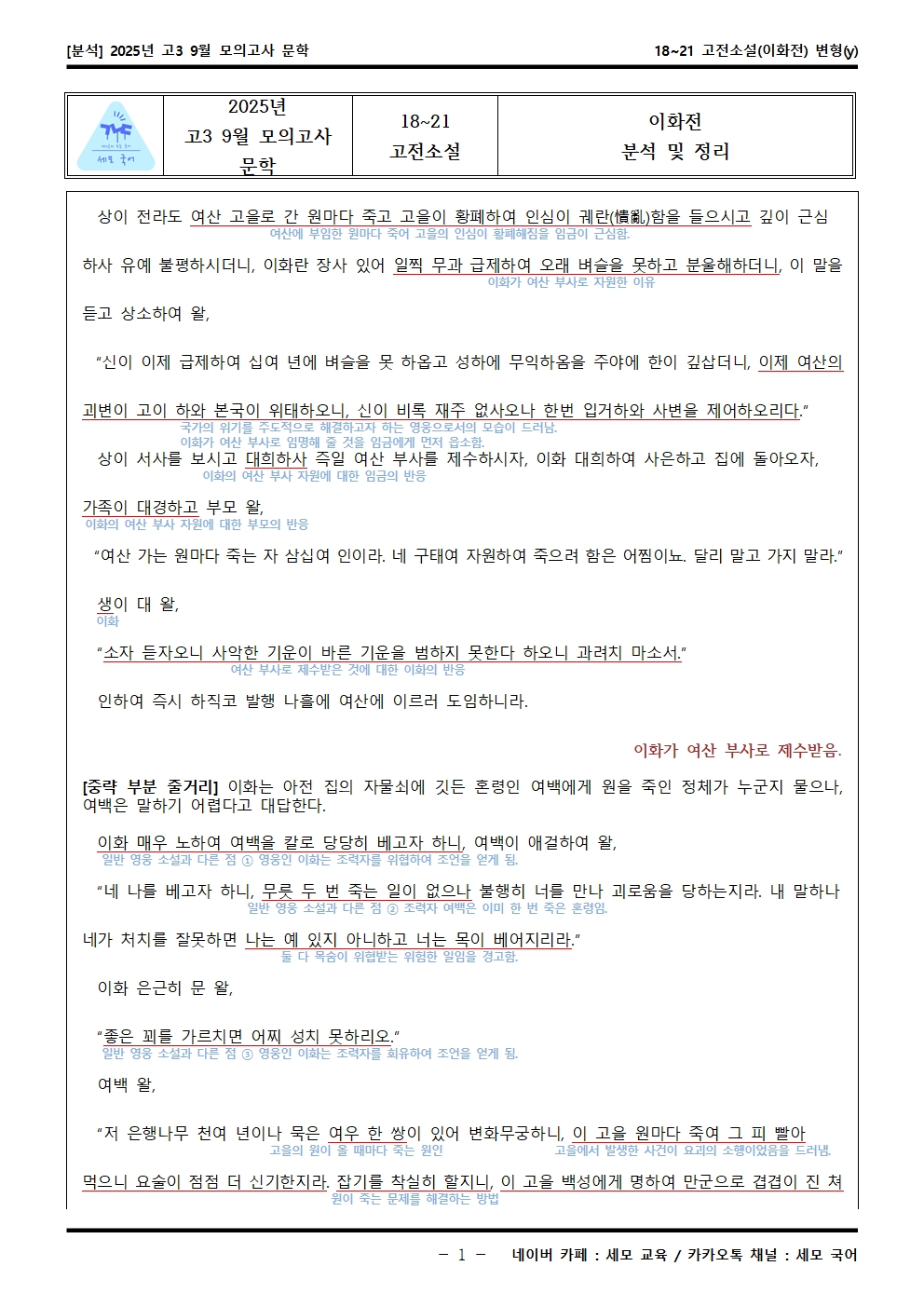 2025년 고3 9월 모의고사 문학 18~21 고전소설(이화전) 분석해석해설은 수능특강이 내신으로 들어가는 학생분들, 그 학생들을 가르치는 강사·교사·과외 선생님들, 수능을 준비하는 수험생들, 기타 자료가 필요하신 분 등을 위한 자료입니다.