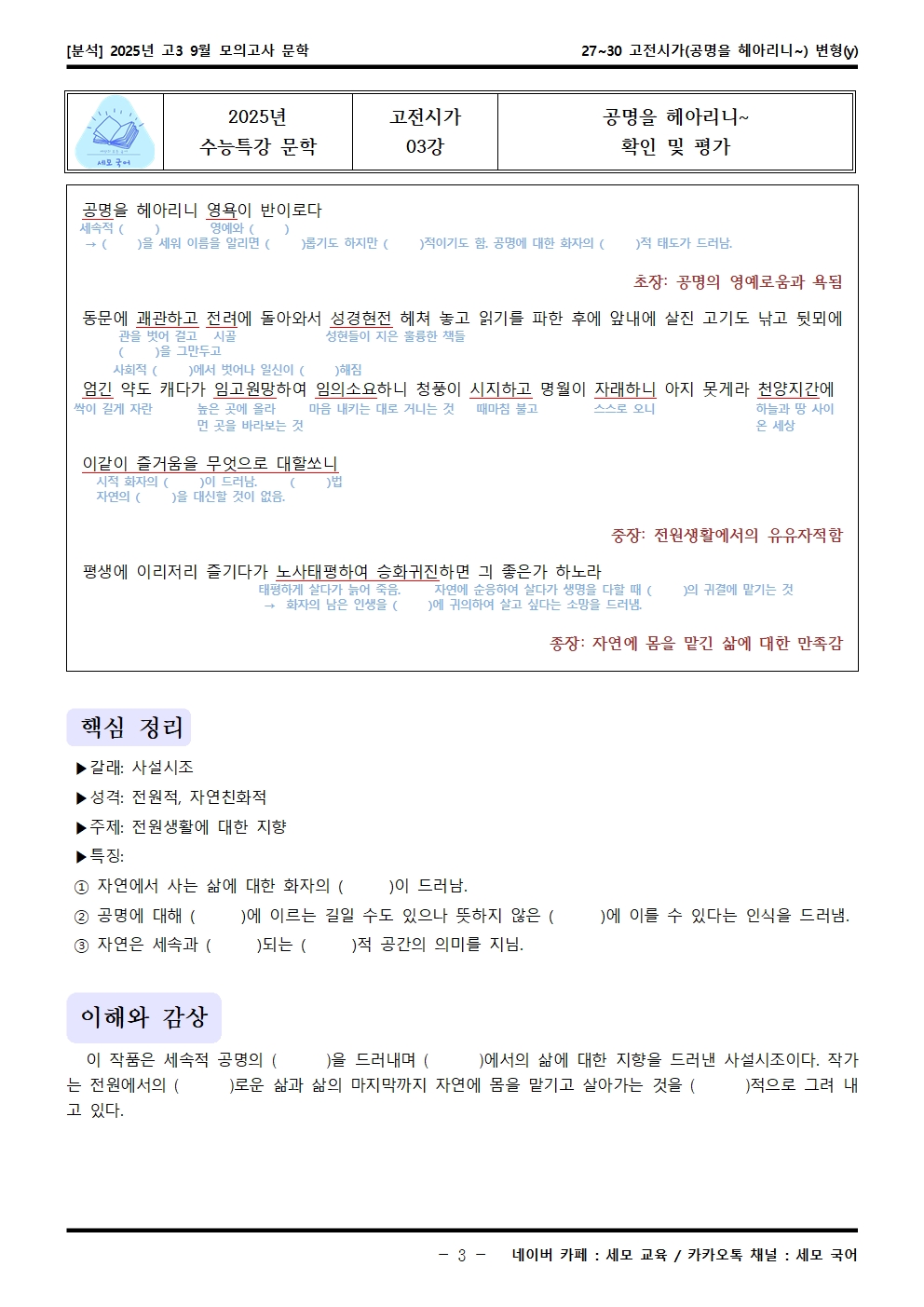 2025년 고3 9월 모의고사 문학 27~30 고전시가(공명을 헤아리니~) 분석해석해설은 수능특강이 내신으로 들어가는 학생분들, 그 학생들을 가르치는 강사·교사·과외 선생님들, 수능을 준비하는 수험생들, 기타 자료가 필요하신 분 등을 위한 자료입니다.