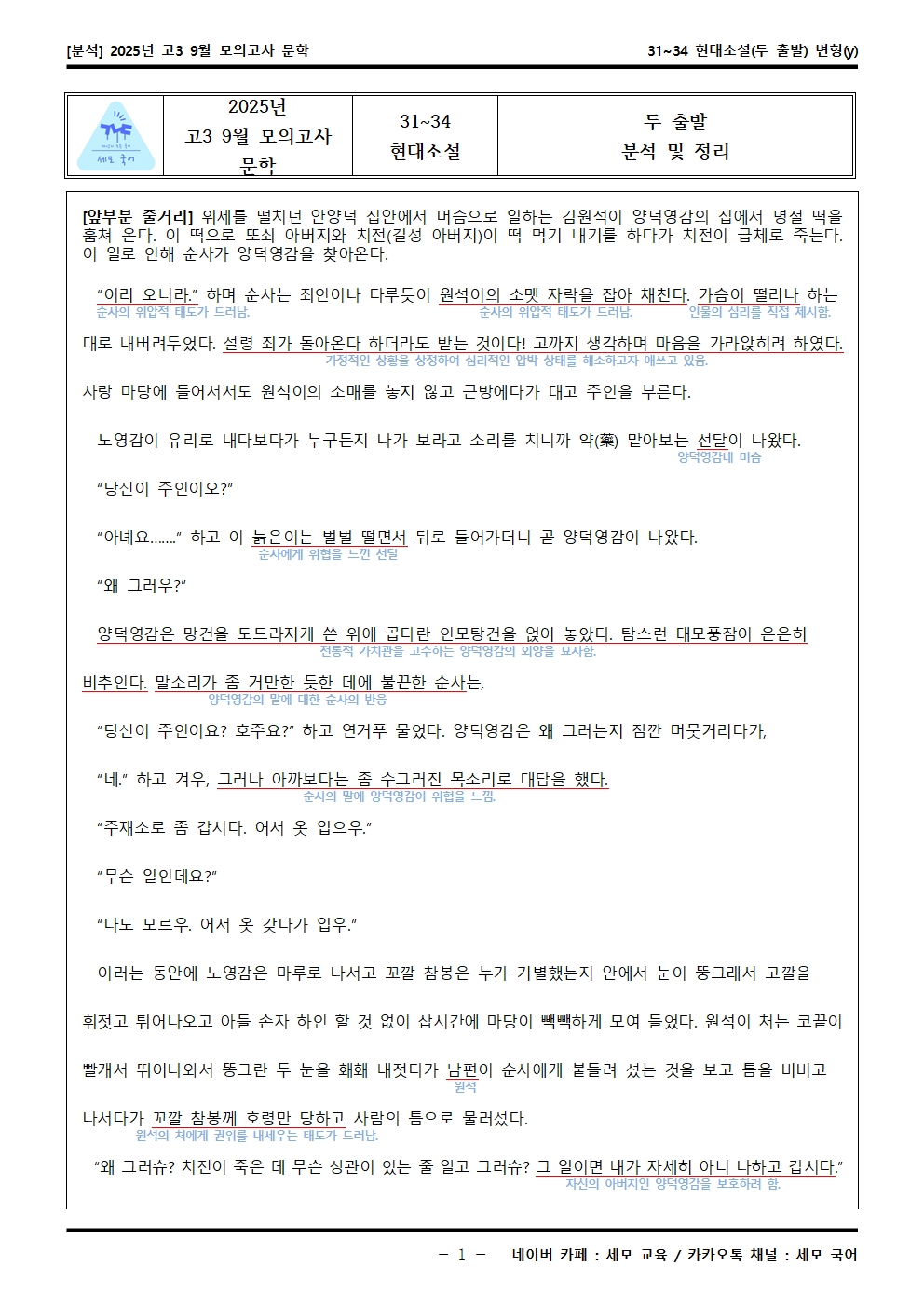 2025년 고3 9월 모의고사 문학 31~34 현대소설(두 출발) 분석해석해설이 제작됐습니다! 세모 국어의 선생님들이 집중하여 최선을 다해 만든 자료인 만큼 내신, 수능 대비에 큰 도움이 되리라 자부합니다.