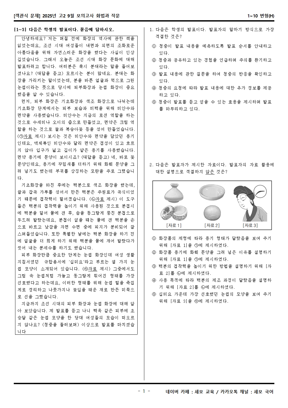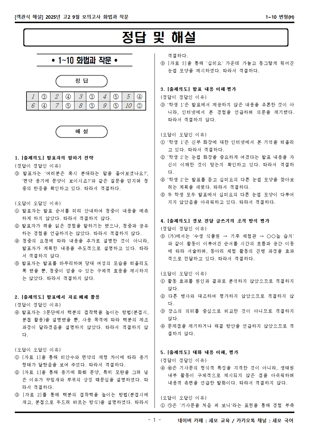 2025년 고2 9월 모의고사 화법과 작문 1~10 변형문제가 제작됐습니다! 세모 국어의 선생님들이 집중하여 최선을 다해 만든 자료인 만큼 내신, 수능 대비에 큰 도움이 되리라 자부합니다.