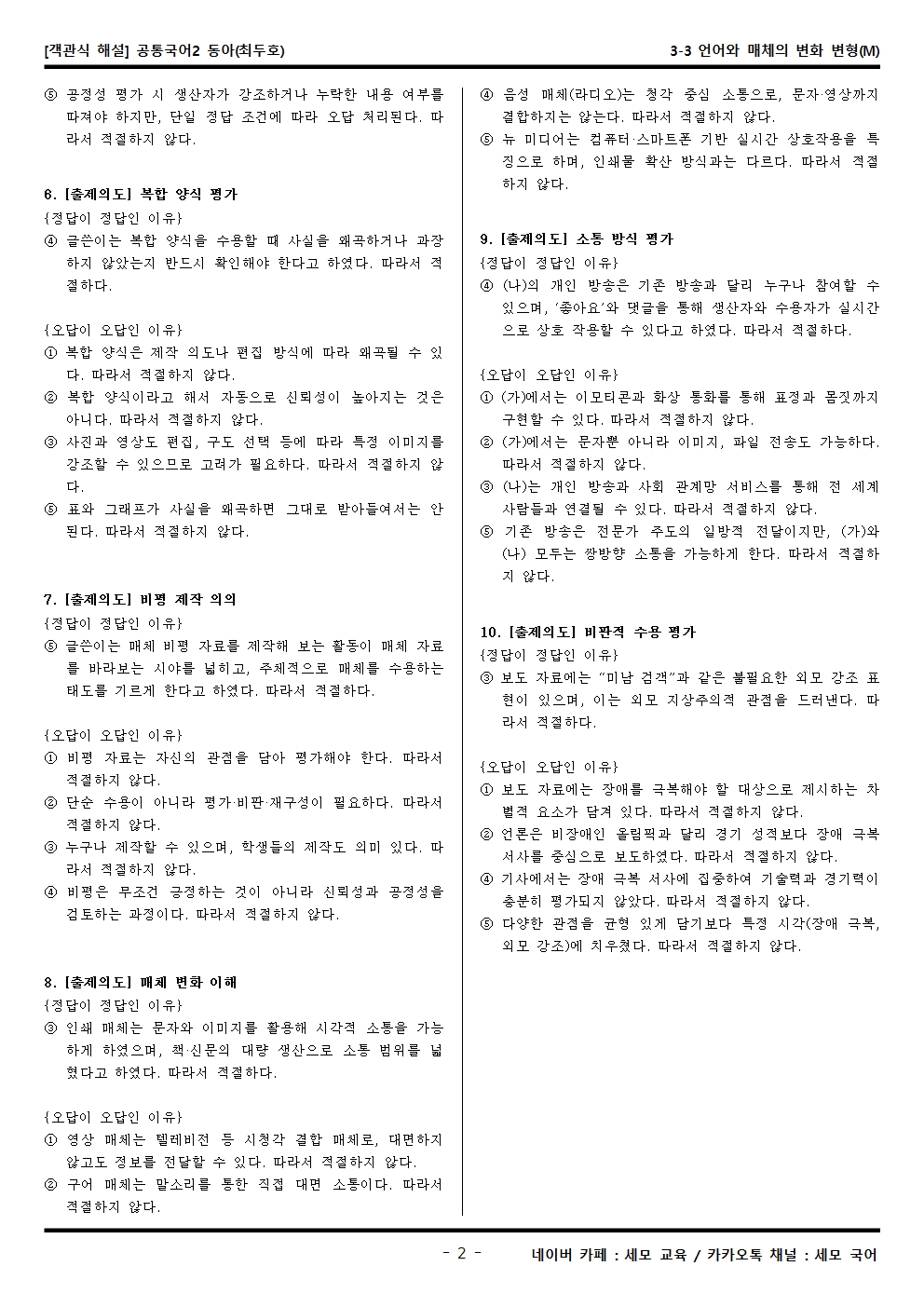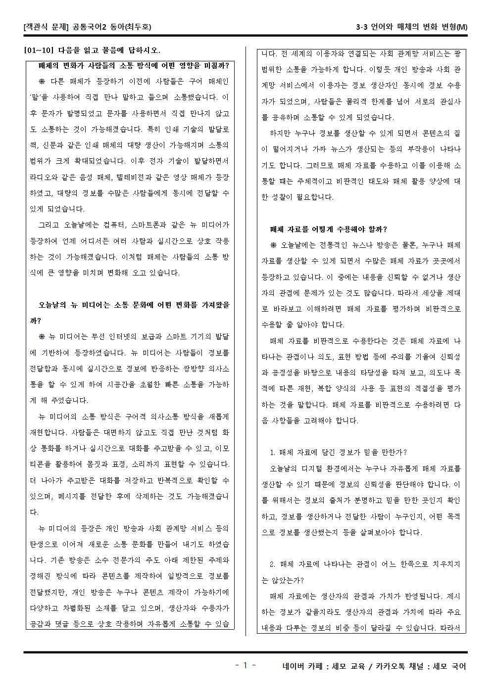 2022 개정 교육과정 고1 공통국어2 동아(최두호) 3-3 언어와 매체의 변화 객관식 변형문제는 공통국어2가 내신으로 들어가는 학생분들, 그 학생들을 가르치는 강사·교사·과외 선생님들, 기타 자료가 필요하신 분 등을 위한 문제입니다.