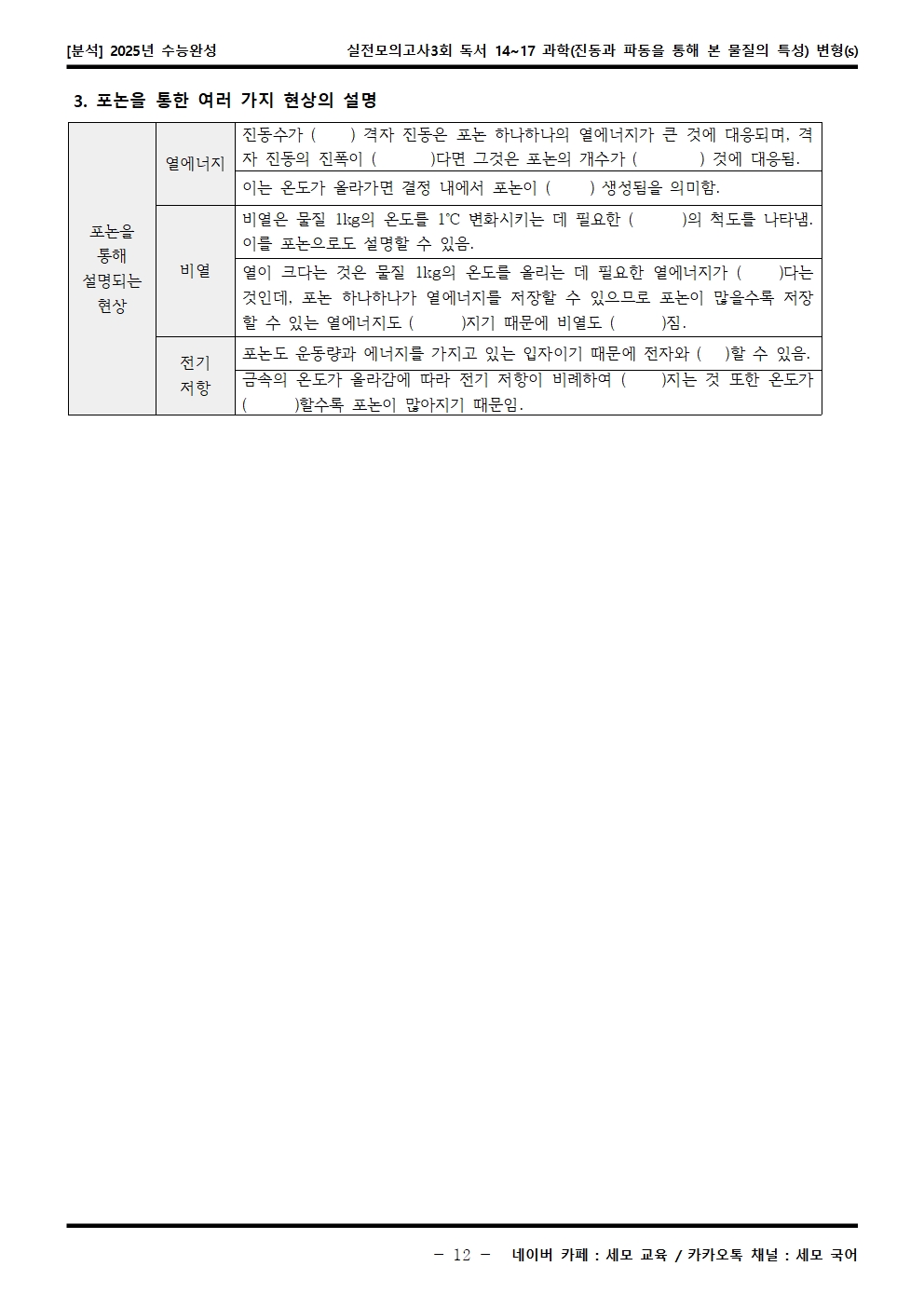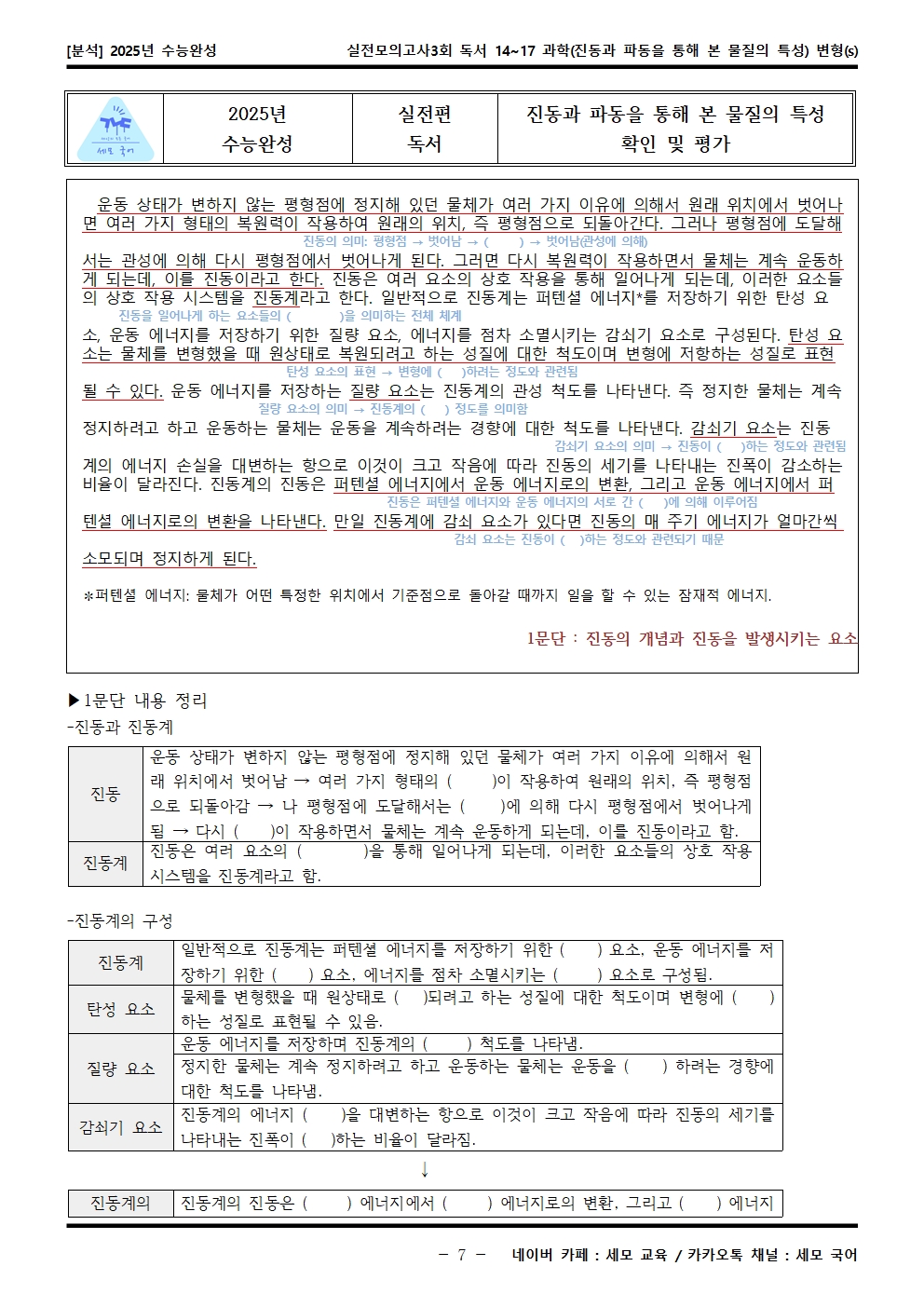 2025년 수능완성 실전모의고사3회 독서 14~17 과학(진동과 파동을 통해 본 물질의 특성) 분석해석해설은 수능특강이 내신으로 들어가는 학생분들, 그 학생들을 가르치는 강사·교사·과외 선생님들, 수능을 준비하는 수험생들, 기타 자료가 필요하신 분 등을 위한 자료입니다.