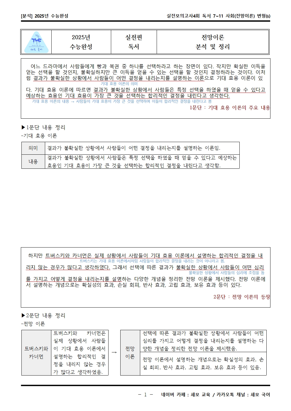 2025년 수능완성 실전모의고사4회 독서 7~11 사회(전망이론) 분석해석해설이 제작됐습니다! 세모 국어의 선생님들이 집중하여 최선을 다해 만든 자료인 만큼 내신, 수능 대비에 큰 도움이 되리라 자부합니다.