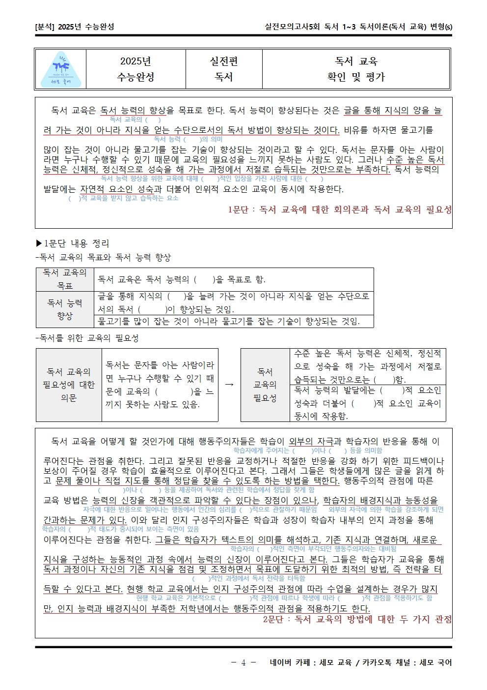 2025년 수능완성 실전모의고사5회 독서 1~3 독서이론(독서 교육) 분석해석해설이 제작됐습니다! 세모 국어의 선생님들이 집중하여 최선을 다해 만든 자료인 만큼 내신, 수능 대비에 큰 도움이 되리라 자부합니다.