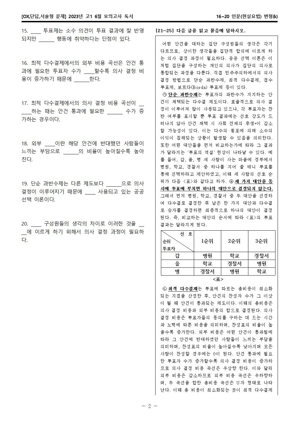 2023년 고1 6월 모의고사 독서 38~42 사회(공공 선택 이론) OX,단답,서술형 변형문제는 모의고사가 내신으로 들어가는 학생분들, 그 학생들을 가르치는 강사·교사·과외 선생님들, 수능을 준비하는 수험생들, 기타 자료가 필요하신 분 등을 위한 문제입니다.