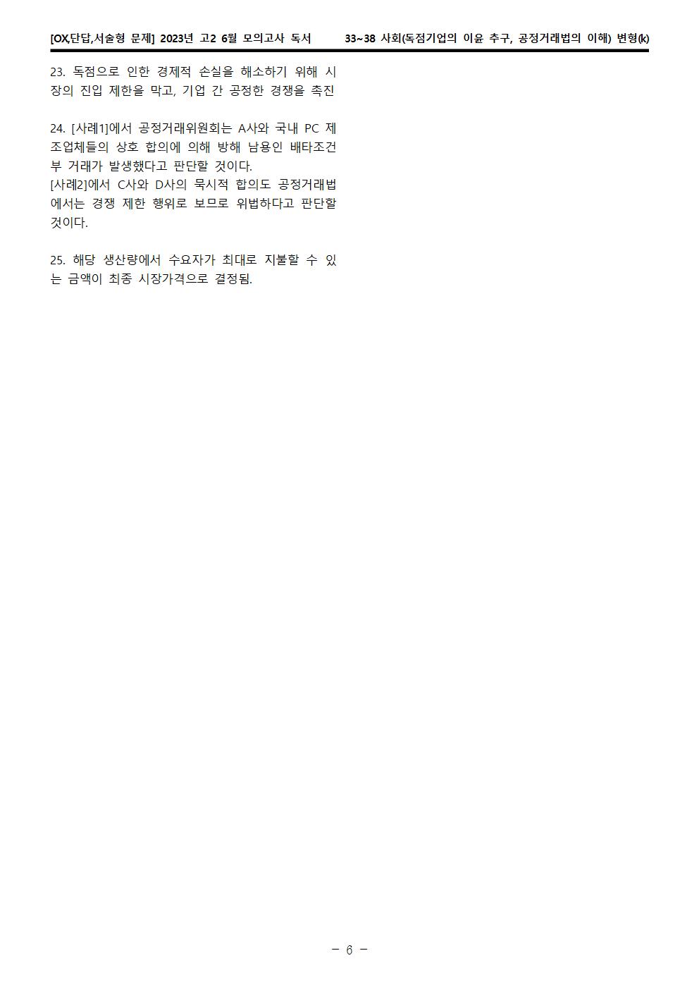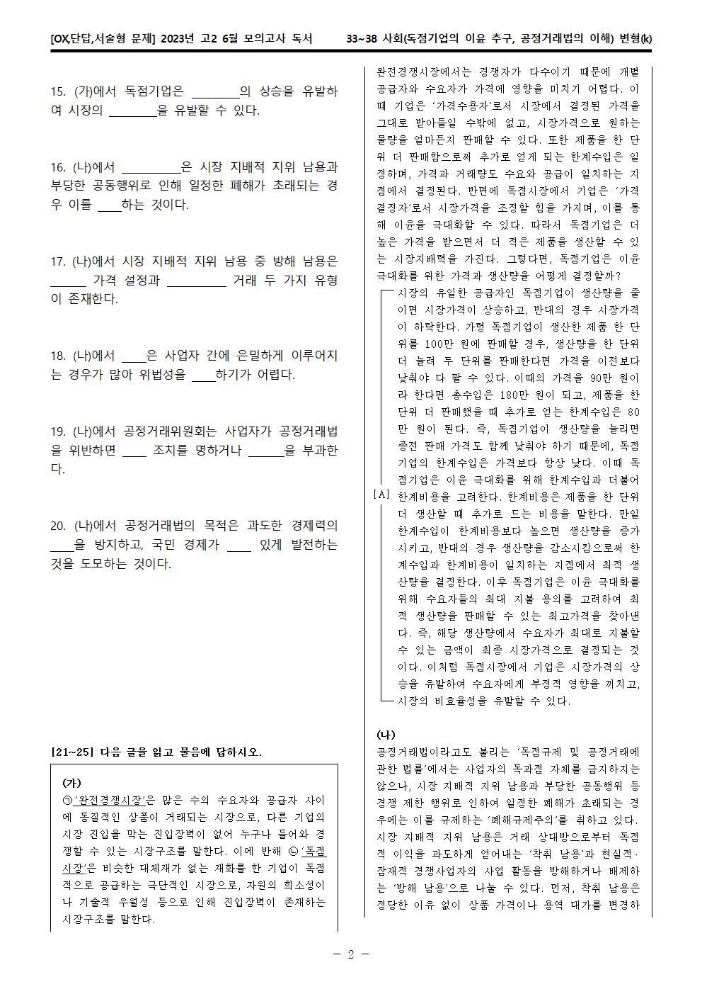 2023년 고2 6월 모의고사 독서 33~38 사회(독점기업의 이윤 추구, 공정거래법의 이해) OX,단답,서술형 변형문제는 모의고사가 내신으로 들어가는 학생분들, 그 학생들을 가르치는 강사·교사·과외 선생님들, 수능을 준비하는 수험생들, 기타 자료가 필요하신 분 등을 위한 문제입니다.